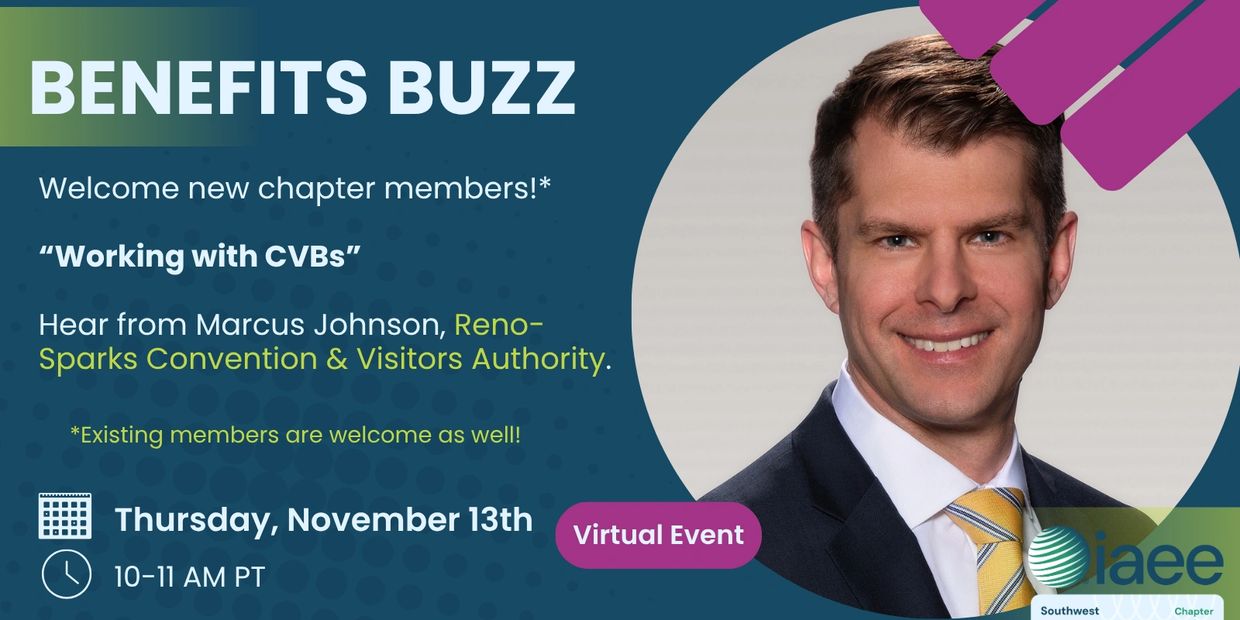 Benefits Buzz is the quarterly meeting to greet new members and make valuable connections. This time, our hosts "The Jills" have invited special guest, Marcus Johnson, to share insights how Reno-Sparks Convention & Visitors Authority has partnered with trade show and event organizers to infuse local experiences, assist with logistics, and provide local know-how to make events pop.